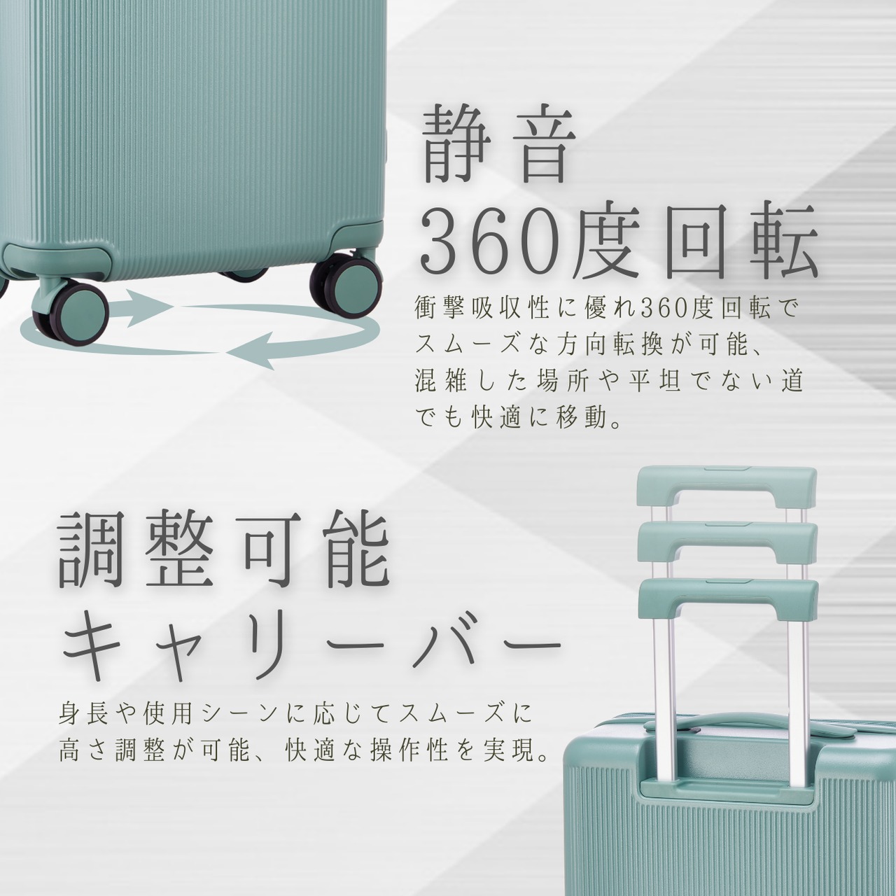 高弾性で衝撃吸収性に優れた静音キャスターを採用。360度自由に回転し、方向転換もスムーズ。混雑した場所や段差のある道でも快適に移動できます。